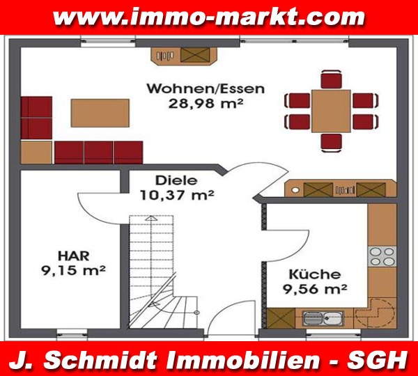 Diele (ca. 9,85 m²), Wohnen/Essen (ca. 29,85 m²), Küche (ca. 10,24 m²) und HAR (ca. 8,13 m²).