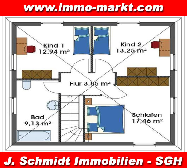 Flur (ca. 3,70 m²), Schlafen (ca. 16,96 m²), Kind (ca. 13,02 m²), Gäste (ca. 13,30 m²) und Bad (ca. 9,06 m²).